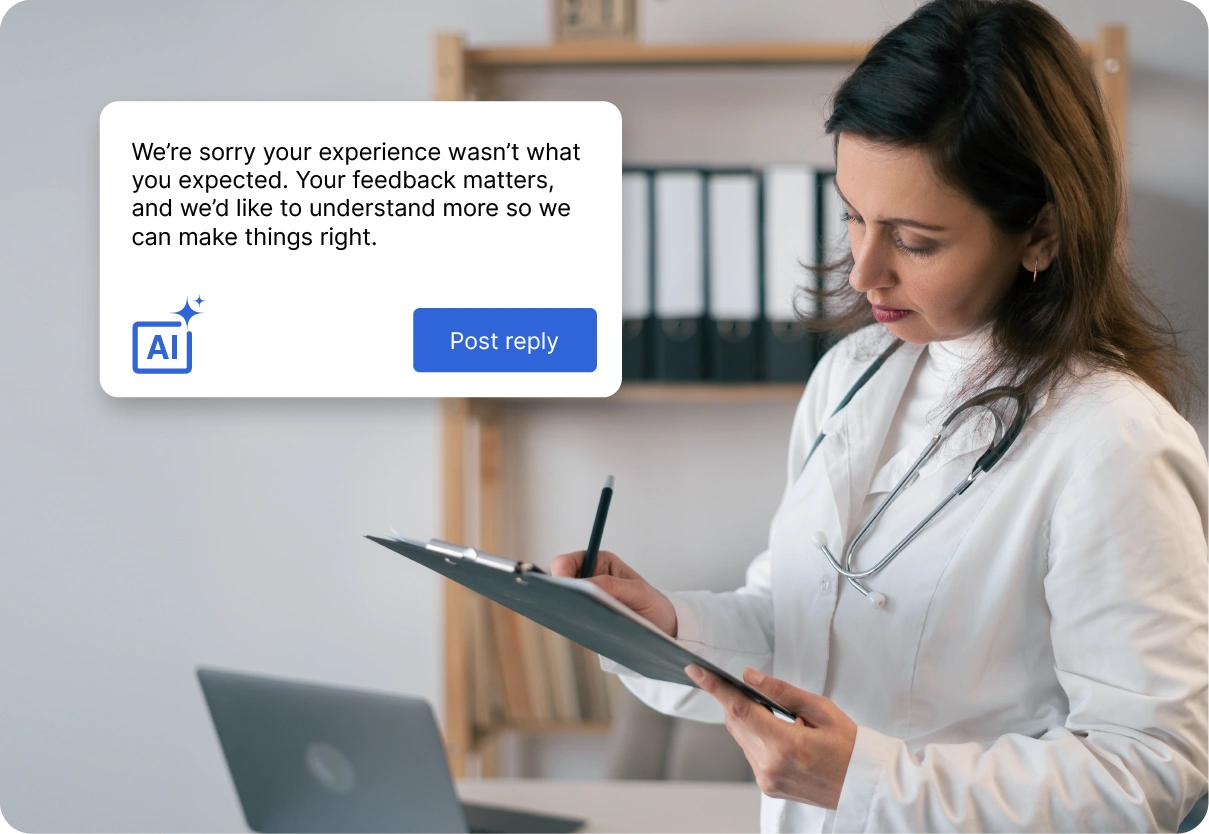 Your PX team can collect and respond to reviews with AI-powered support. Manage negative feedback confidently and strengthen lasting patient relationship.